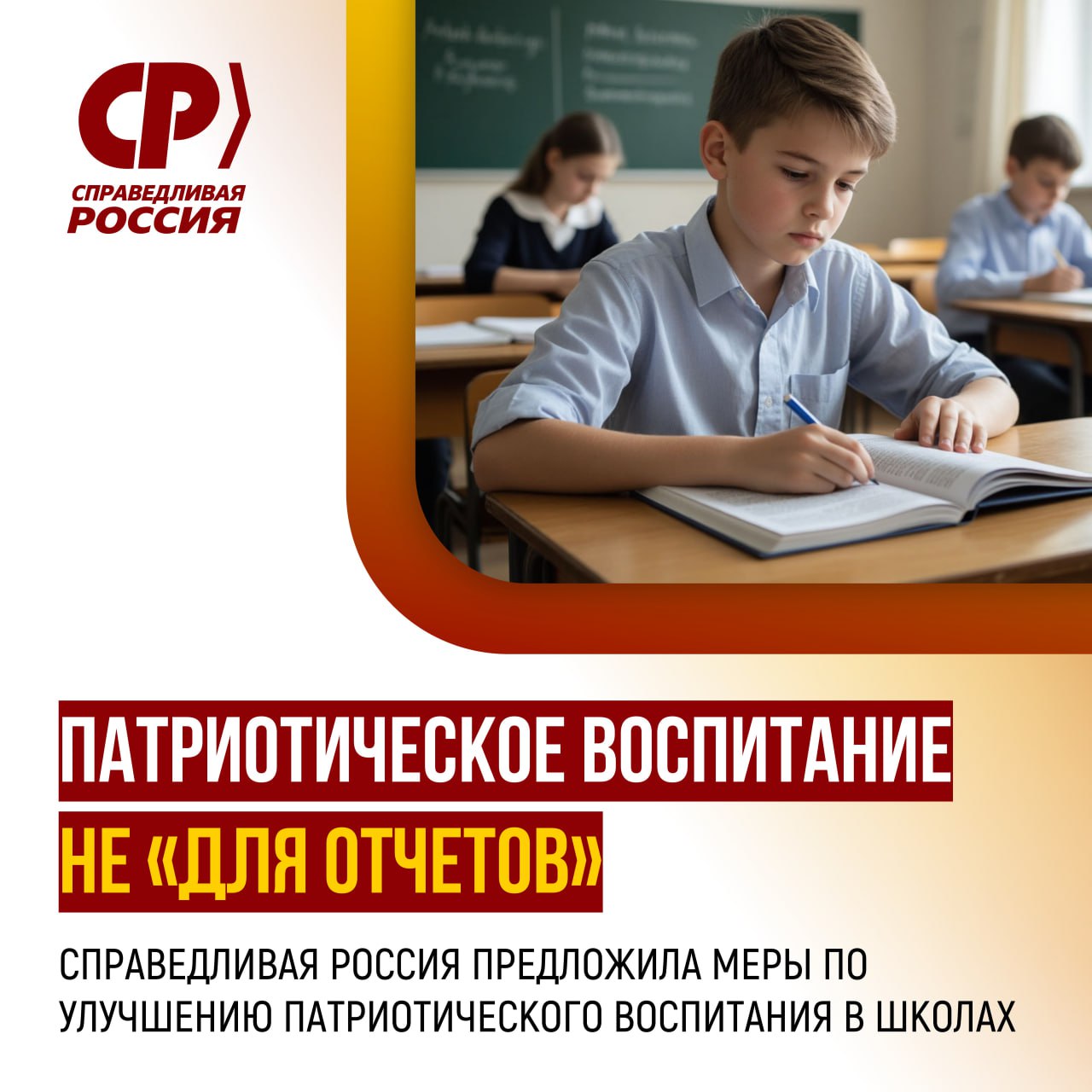 Лидер партии СПРАВЕДЛИВАЯ РОССИЯ Сергей Миронов направил министру просвещения Сергею Кравцову предложения, связанные с развитием патриотического воспитания в школах.